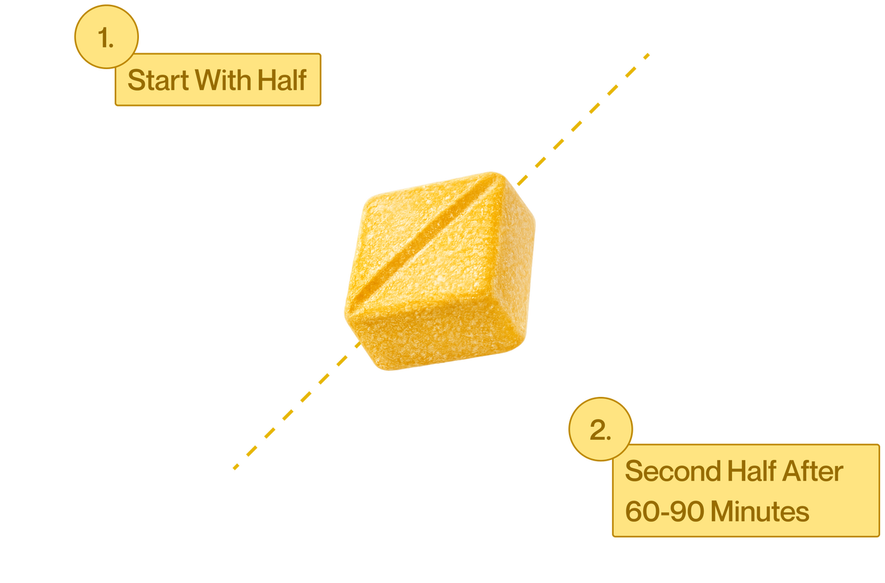 Cut one gummy along the diagonal line and start with half. Wait 60-90 minutes before deciding if you want the other half. Your body needs time to process it through your digestive system.