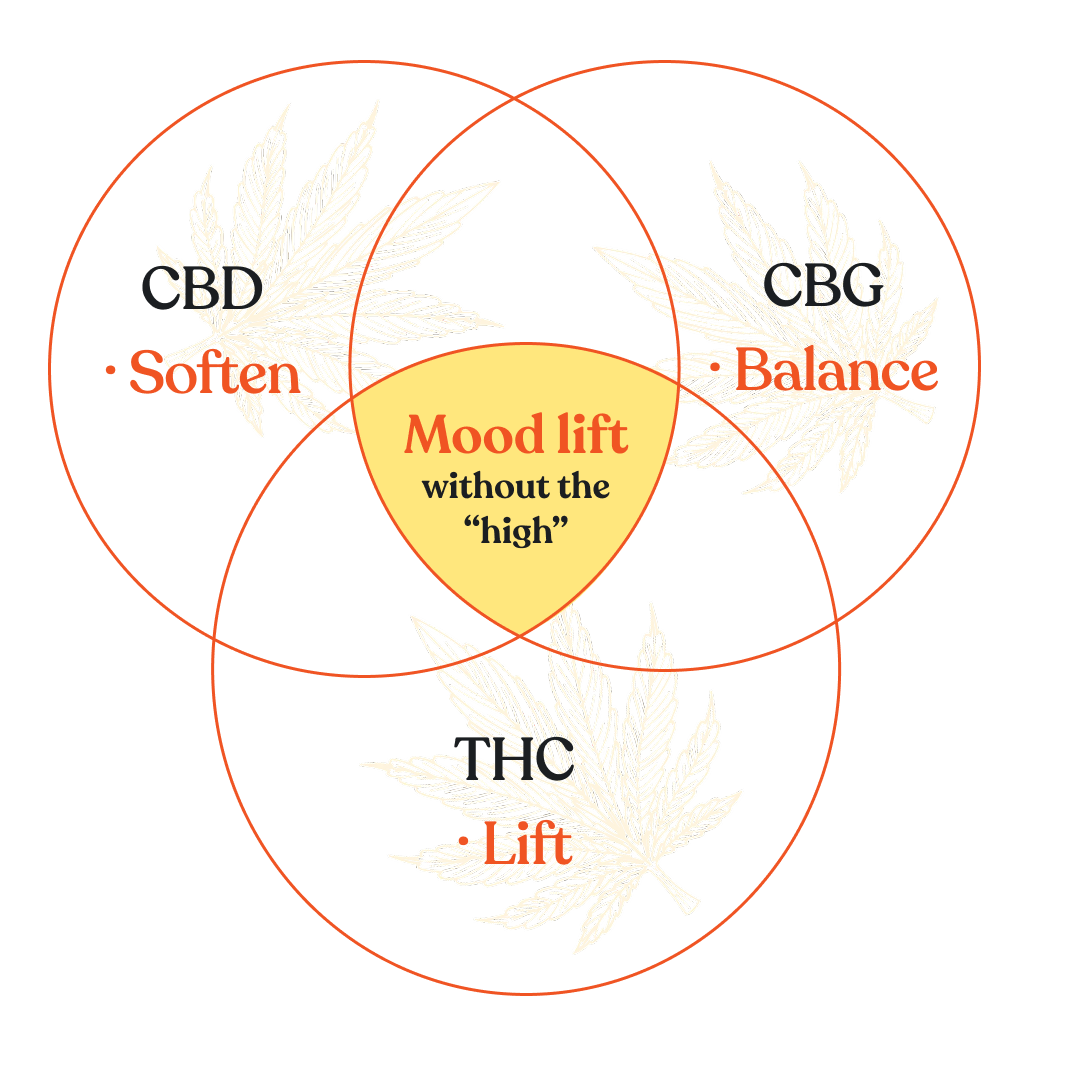 A gentle lift. Fewer racing thoughts, looser shoulders, and a quiet “I’m good” feeling. You’re not high or numb — just a calmer, lighter version of yourself. CBD and CBG smooth things out, with a micro-dose of THC adding a subtle warmth.
